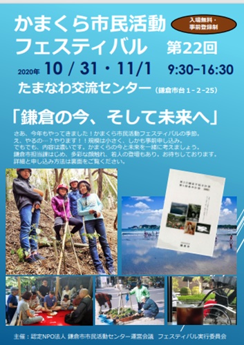 新型コロナが猛威を振るう中、 第22回かまくら市民活動フェスティバルを無事開催できたことを、 まずはご協力、ご参加いただいた団体、市民の皆さまに御礼いたしますと共に、 当方の不手際により、ご案内が遅れ、 ご参加のチャンスを逃された皆さまには深くお詫びをいたします。