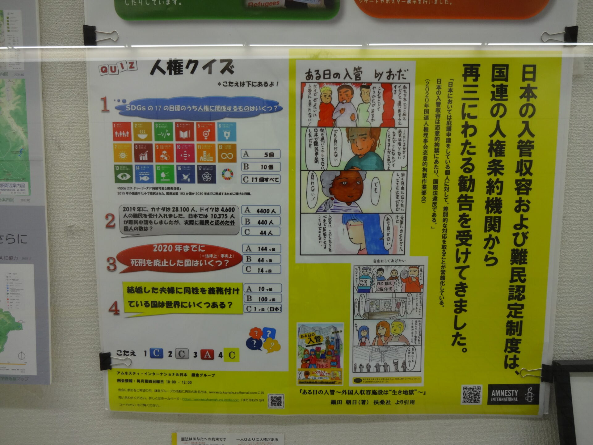 アムネスティ・インターナショナル ( Amnesty International = AI )は、世界人権宣言が守られる社会の実現をめざし、世界200以上の国・地域に少なくとも700万人以上の会員・サポーターが活動する国際NGOです。1961年に英国で発足し、1977年にはノーベル平和賞を受賞しました。日本支部は1970年に設立されました。AIの基本的な活動は、市民が発言したことを理由に拘留されるような人権侵害を止めるために、その政府に改善を求める手紙やメールを送るという、平和的な手段により、社会を変革しようとするものです。鎌倉グループは1988年に、多国籍の人たちによって結成され、主に鎌倉生涯学習センターで例会を開催しています。昨今では、海外の人権問題のみならず、移民・難民問題、入管施設問題、いじめ・偏見・ジェンダーなどの問題についても議論をしています。お問い合わせくだされば、例会へお誘いします。