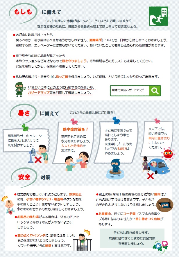 鎌倉市からの受託でファミリーサポートセンター事業を運営。そのほか、自主事業として、鎌倉市からの受託で「子育て世帯訪問支援事業」を実施。また、学校に足が向かない子どもや保護者のための「いばしょのひとつ」を市民団体「いろんなカタチ鎌倉」と協働開催。