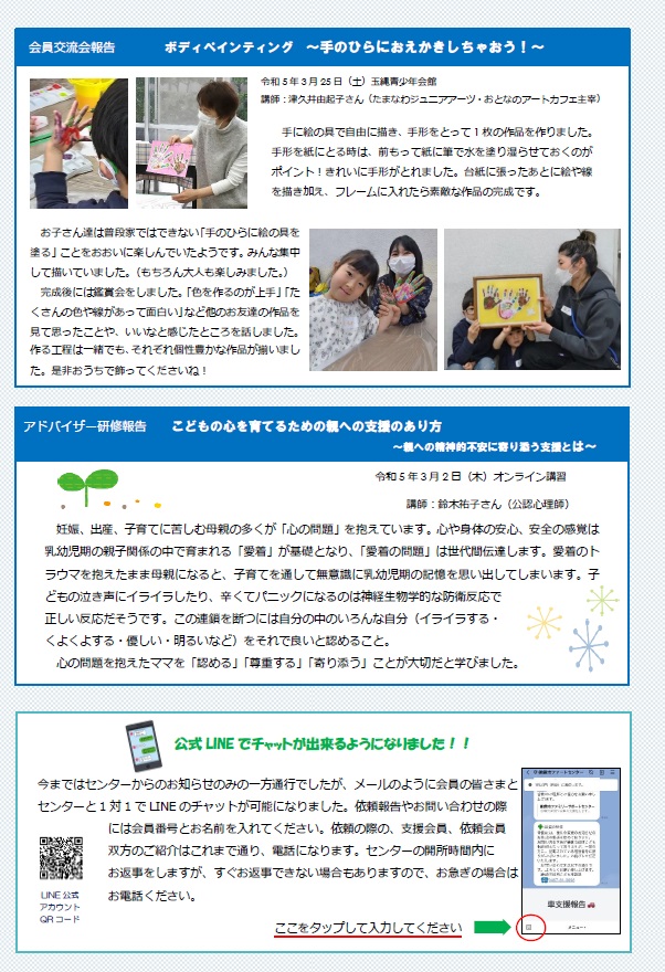 子育ての手助けが欲しい依頼会員と手助けをしたい支援会員をつなげる活動をしています。子育てを地域で相互援助するお手伝いをしています。窓口や訪問での依頼会員の登録や、支援会員になってもらうための講習会を開催しています。