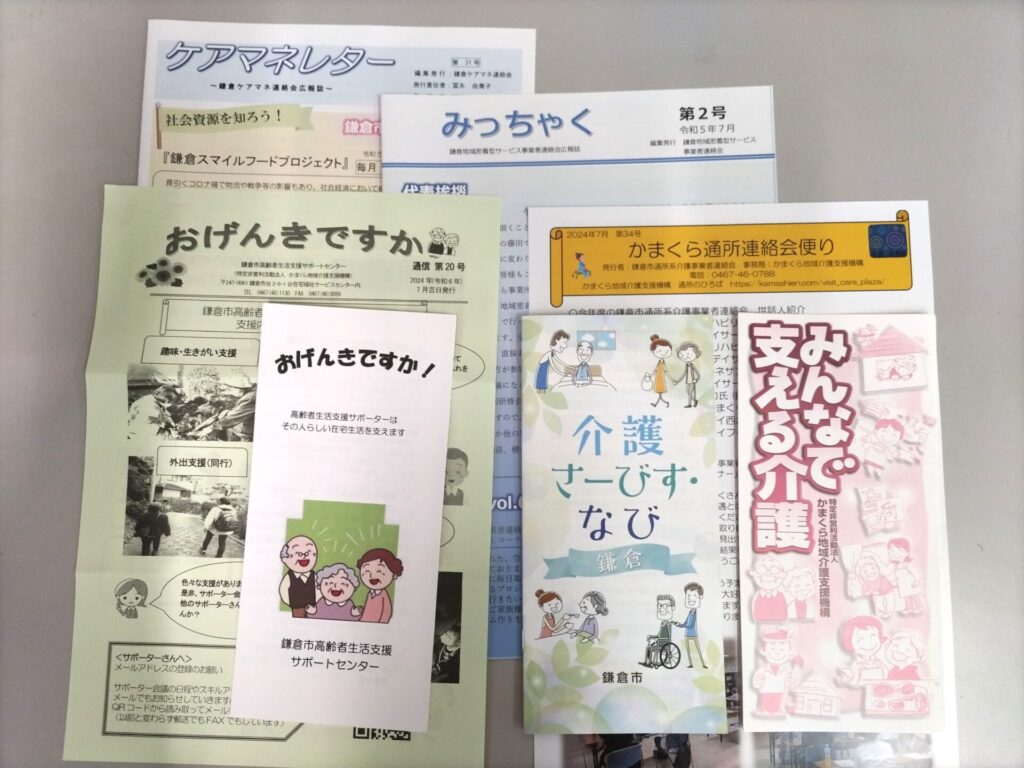 「鎌倉ケアマネ連絡会」、通所系介護や訪問介護、地域密着型サービスなどの各事業者連絡会、「情報提供委員会」「研修企画委員会」等委員会を設置し、事業者間の交流や情報交換、研修等を行う。またターミナルケアや食、生活支援に関する勉強会も発足させ、市民の方も参加するなど活発に活動している。
