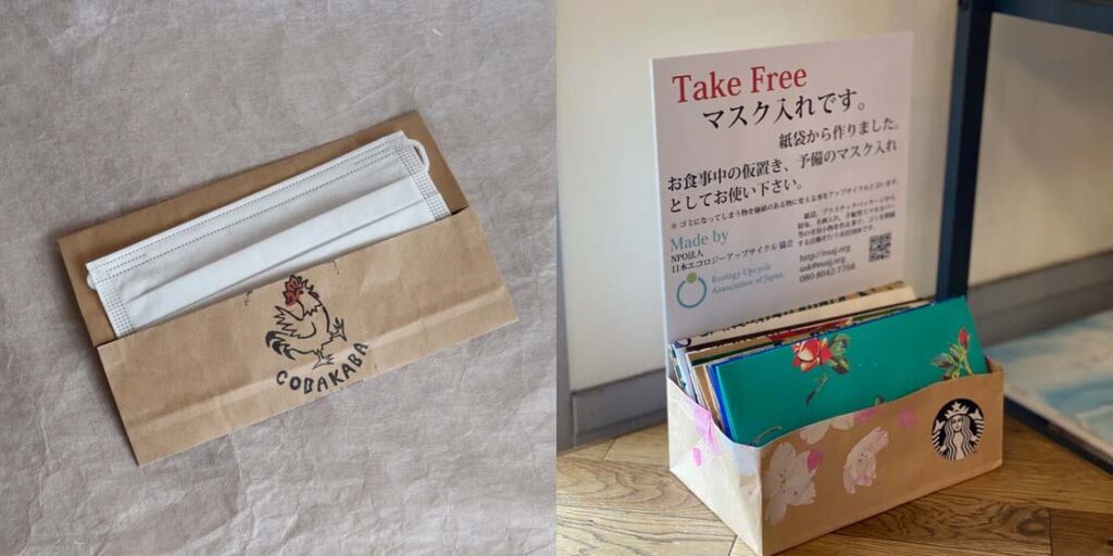 紙袋、プラ袋、チョコレートの箱などからマスク入れ、名刺入れ、財布、手帳型スマホカバー等の実用小物を作る事で、ゴミを減らす活動をしています。