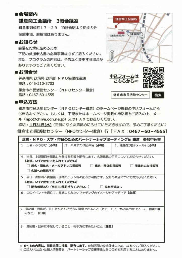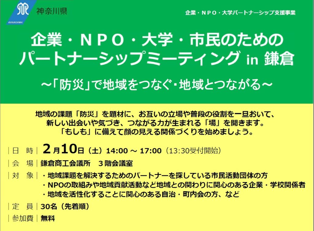 | 主催 | 神奈川県・NPO法人鎌倉市市民活動センター運営会議(鎌倉市市民活動センター指定管理者) |
