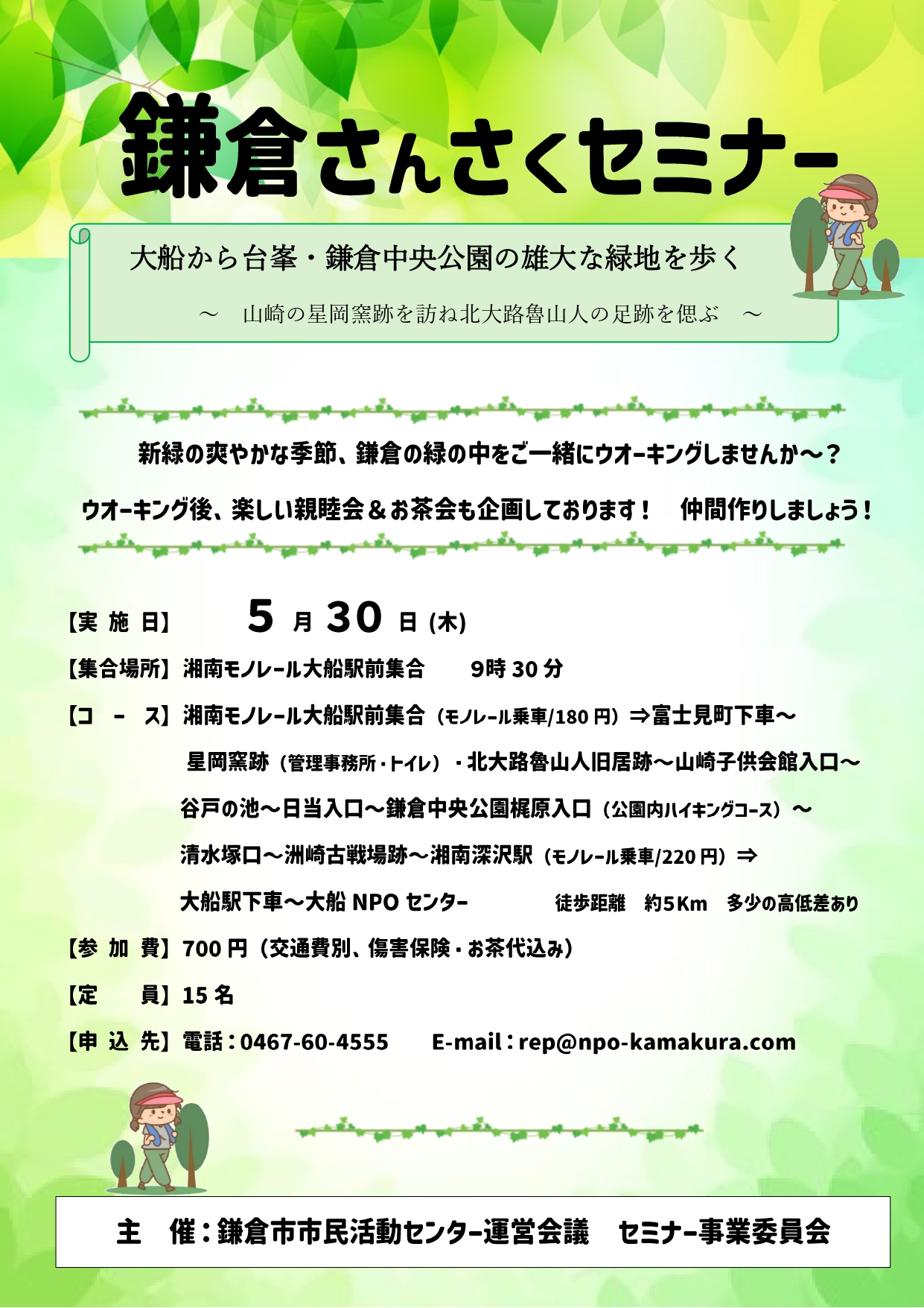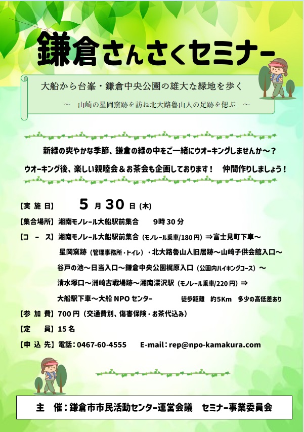~山崎の星岡窯跡を訪ね北大路魯山人の足跡を偲ぶ~ 新緑の爽やかな季節、鎌倉の緑の中をご一緒にウォーキングしませんか。ウォーキング後に、楽しい親睦会&お茶会も企画しております!仲間作りしましょう! ※雨天中止 日付令和6年5月30日(木)集合時間9時30分集合場所 湘南モノレール大船駅前集合コース湘南モノレール大船駅前集合(モノレール乗車/180円)⇒富士見町下車~星岡窯跡(管理事務所・トイレ) 北大路魯山人旧居跡~山崎子供会館入口~谷戸の池~日当入口~鎌倉中央公園梶原入口(公園内ハイキングコース)〜清水塚口~洲崎古戦場跡~湘南深沢駅(モノレール乗車/220円)⇒大船駅下車~大船 NPO センター ※徒歩距離 約5Km 多少の高低差あり参加費700円(交通費別途、傷害保険・お茶代込み)定員15名申込先電話:0467-60-4555 E-mail: *protected email*主催鎌倉市市民活動センター運営会議 セミナー事業委員会 チラシはこちらPDFを見る