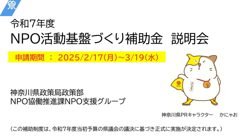 神奈川県では、設立から10年以内のNPO法人を対象に、活動基盤を整え成長を後押しするため、スタッフの育成や資金調達力の強化を目的とした事業に対して補助金を交付します。(この補助制度は、令和7年度当初予算の県議会の議決に基づき、正式に実施が決定されます。)