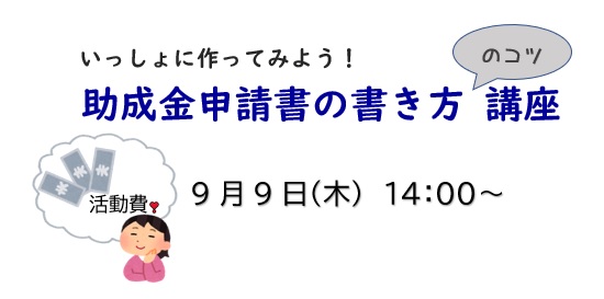 活動資金捻出のために助成金に応募したい!でも申請書の書き方が分からない・・・。そんな方のために、申請の基礎知識から事業計画や予算の作り方のポイントなどを考えます。※本講座はコロナ関連給付金・助成金・補助金申請向けではありません。 日時2021年9月9日 14時場所NPOセンター鎌倉 2階 会議室定員10名受講料無料主催鎌倉市市民活動センター問合せ鎌倉市市民活動センター電話:0467-60-4555 FAX:0467-61-3928Mail:*protected email* 助成金講座チラシPDFを見る