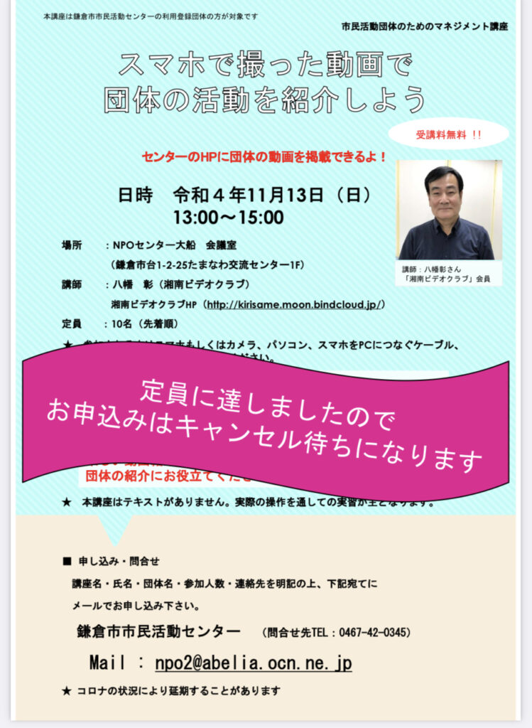 2022年11月13日(日)NPOセンター大船にて「スマホで撮った動画で団体の活動を紹介しよう」の講座を開催しました。定員10名満員御礼。講師の手元をカメラで撮影しながらレジュメに説明を加えていく様子、また動画作成のアプリの説明にもパソコン画面をプロジェクターで映しながらの実践的な指導により、受講生にとって自前のパソコンを操作するのにとても理解しやすい講義でした。