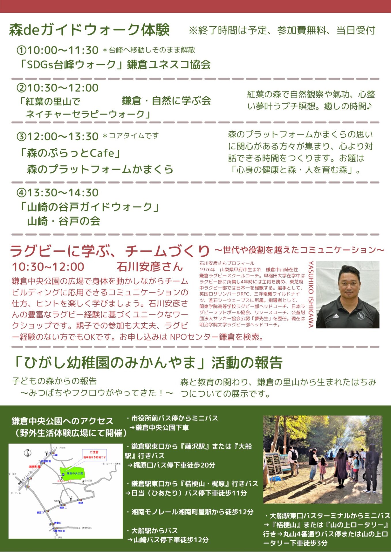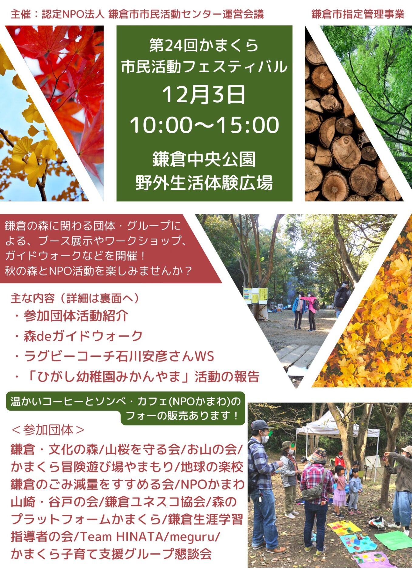 【出展団体】鎌倉・文化の森、山桜を守る会、かまくら冒険遊び場やまもり、鎌倉のゴミ減量をすすめる会、地球の楽校、山崎・谷戸の会、鎌倉ユネスコ協会、鎌倉学習指導者の会、お山の会、森のプラットフォームかまくら、meguru、NPOかまわ、Team HINATA、マナビノキ、かまくら子育て支援グループ懇談会、ひがし幼稚園